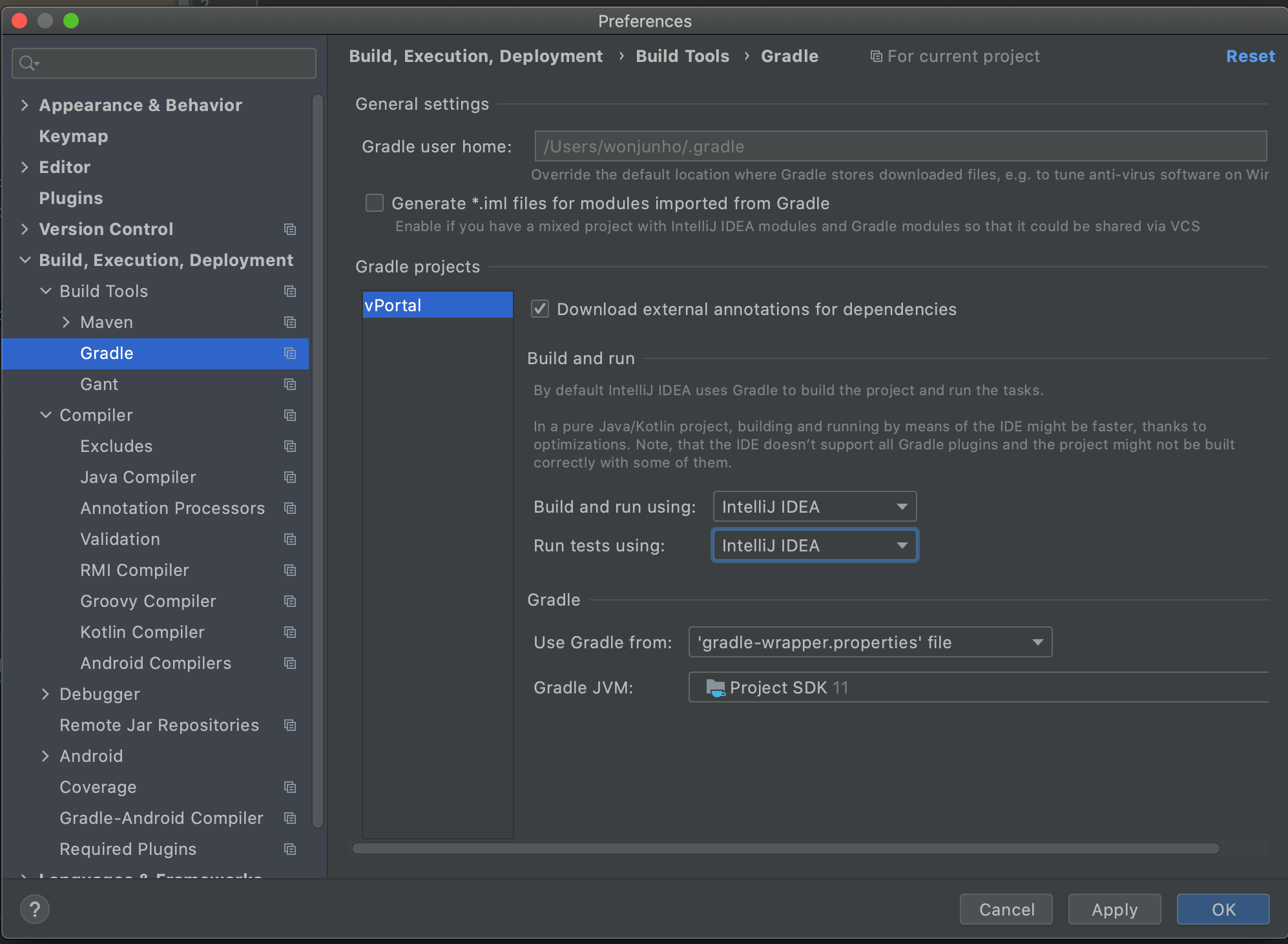 (맥 기준) 이럴 경우, Preferences > Build, Execution, Deployment > Build Tools > Gradle에 접근한다.
