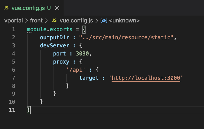 front 프로젝트에서 vue.config.js 파일을 생성하고 아래 코드를 작성한다.