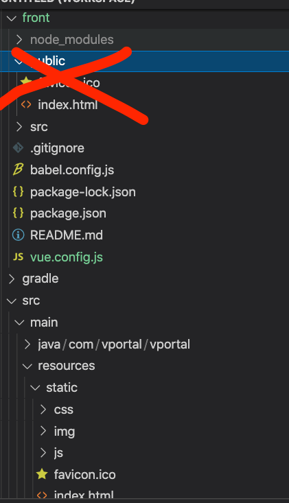 즉, front 폴더 안에 있는 public 폴더는 이제 필요가 없으니 삭제해도 된다.