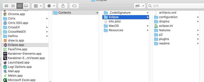 - eclipse.ini 는 eclipse.app 우클릭 -> 패키지 내용 보기 -> Contents -> Eclipse -> eclipse.ini에 접속한다.