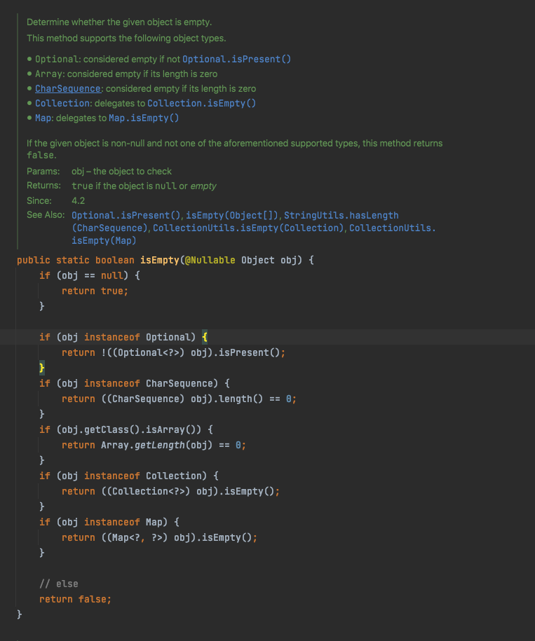 그래서 검색해보니 ObjectUtils.isEmpty로 해결이 가능했다