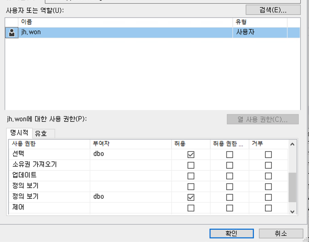 이때 권한은 필요한 권한을 선택하면 되는데, 외부에 제공할 view의 경우 수정 삭제가 있으면 안되기 때문에 참고한 블로그와 동일하게 "선택(select)와 정의보기" 권한 두가지만 부여했다.