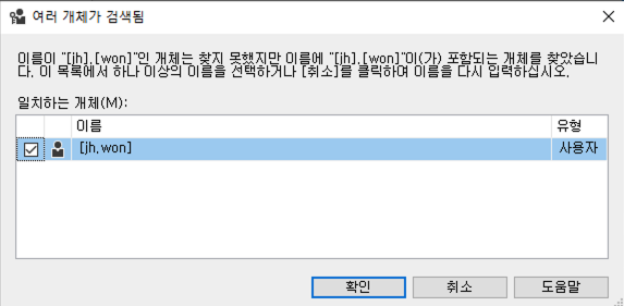사용권한 > 검색 > 선택할 개체 이름 입력 -> 생성한 아이디 입력 >