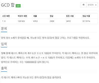 - 그러면 이 짝에서 n(n-1) / 2개의 최대공약수들이 나오는데 그 수는 1 ~ 1,000,000의 범위를 가 지므로 총 합의 최대범위는 100*99 / 2 * 1,000,000 = 4,950,000,000(49억)이다.
